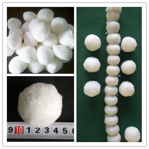 纖維球的制作——纖維球可以根據(jù)需求制作成直徑25mm--80mm不同球徑大小的纖維濾球,其材質(zhì)可采用滌綸,腈綸,丙綸等不同材質(zhì),制作工藝大同小異,把長(zhǎng)條的長(zhǎng)絲經(jīng)過(guò)梳理分成需要的束粗,結(jié)扎,裁剪,成型。